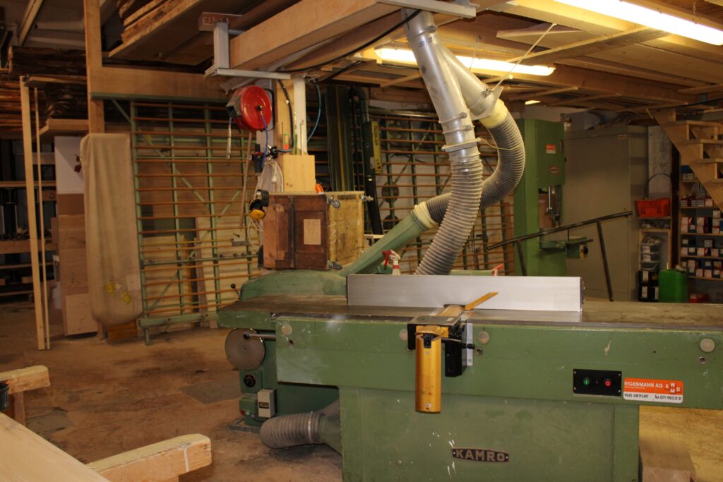 Die Werkstatt wurde zuvor 27 Jahre lang von Niklaus Breitenmoser betrieben. Ueli Scherrer konnte den bewährten Maschinenpark übernehmen und ihn mit eigenen Maschinen ergänzen. Hier riecht es nach Holz, Späne fliegen durch die Luft – und es entstehen mit viel Sorgfalt und Leidenschaft massive Möbel, Parkett und individuelle Holzarbeiten aus regionalem Holz.
