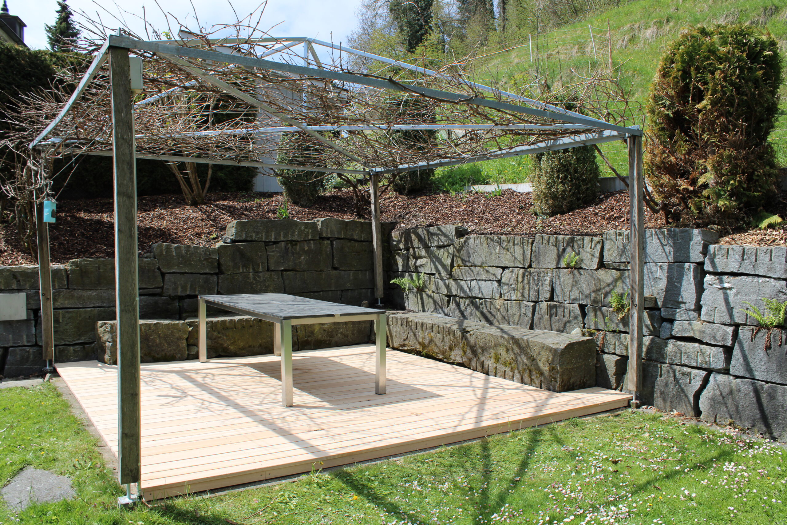 Terrassendielen aus Ulmen Holz und Pergola für eine gemütliche Gartenatmosphäre. Geniessen Sie die Sonne im eigenen Garten.